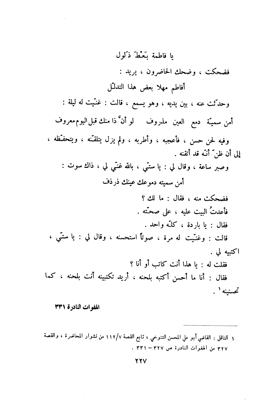 فقال: أنا ما أحسن أكتبه بلحنه، أريد تكتبينه أنت بلحنه، كما تحسنينه «1» .