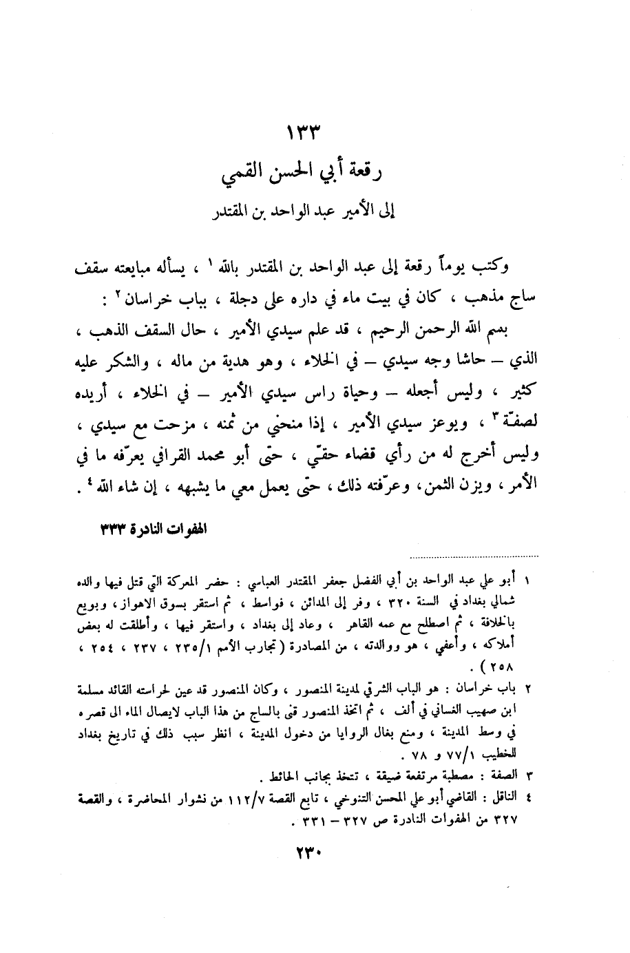 133 رقعة أبي الحسن القمي إلى الأمير عبد الواحد بن المقتدر