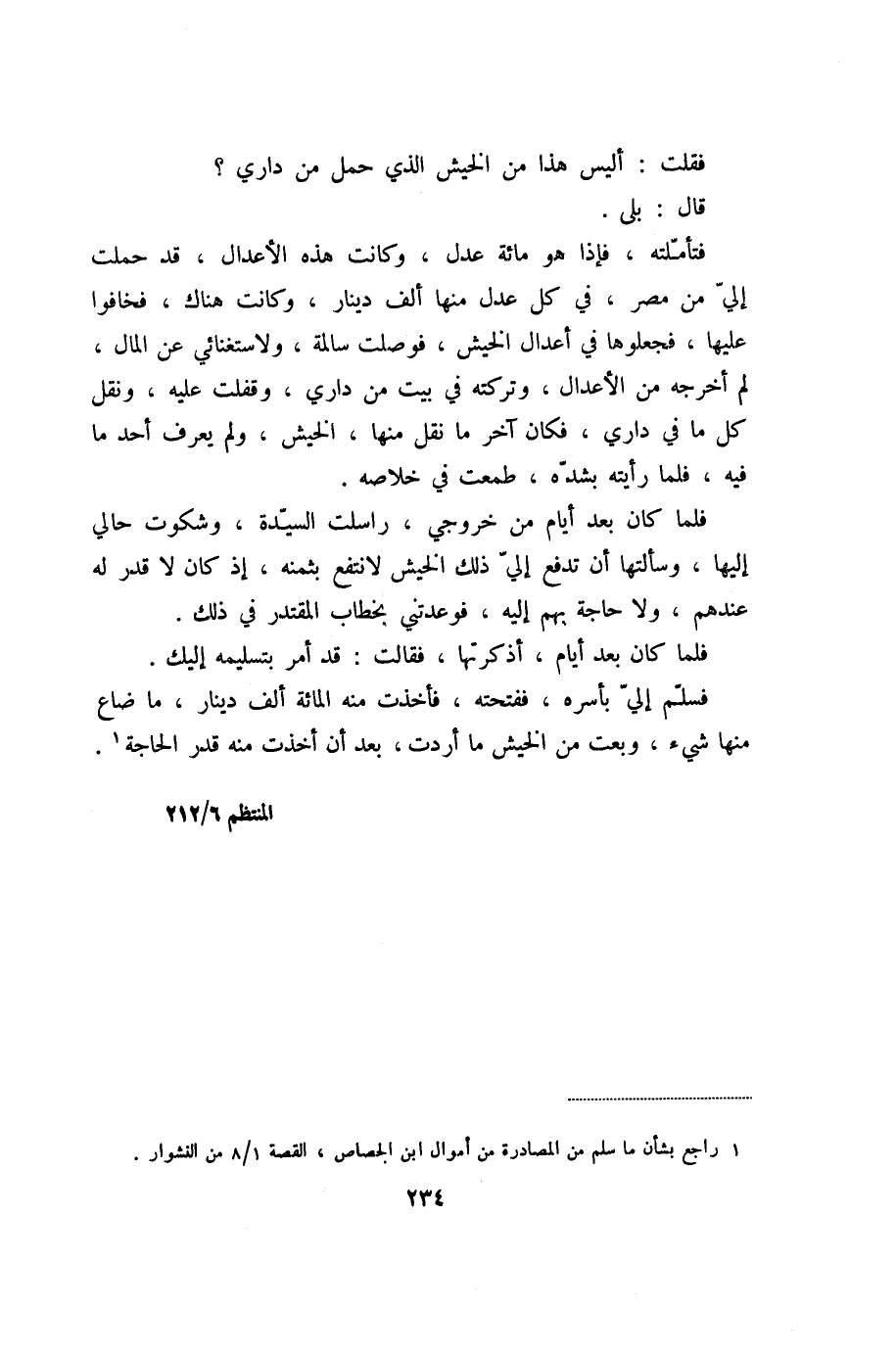 فتأمّلته، فإذا هو مائة عدل، وكانت هذه الأعدال، قد حملت إليّ من مصر، في كل عدل منها ألف دينار، وكانت هناك، فخافوا عليها، فجعلوها في أعدال الخيش، فوصلت سالمة، ولاستغنائي عن المال، لم أخرجه من الأعدال، وتركته في بيت من داري، وقفلت عليه، ونقل كل ما في داري، فكان آخر ما نقل منها، الخيش، ولم يعرف أحد ما فيه، فلما رأيته بشدّه، طمعت في خلاصه.