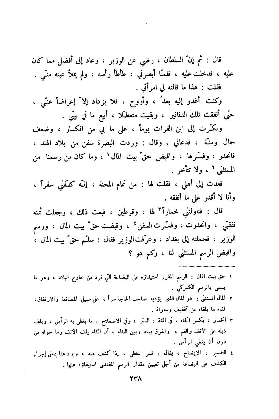 قال: فناولتني خمارا «3» لها، وقرطين، فبعت ذلك، وجعلت ثمنه نفقتي، وانحدرت، وفسّرت السفن «4» ، وقبضت حقّ بيت المال، ورسم الوزير، فحملته إلى بغداد، وعرّفت الوزير فقال: سلّم حقّ بيت المال، واقبض الرسم المستثنى لنا، وكم هو؟