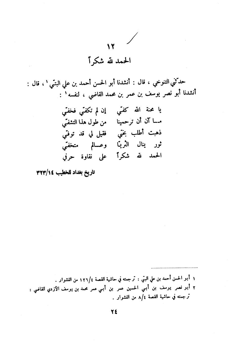 حدّثني التنوخي، قال: أنشدنا أبو الحسن أحمد بن علي البتّي «1» ، قال: