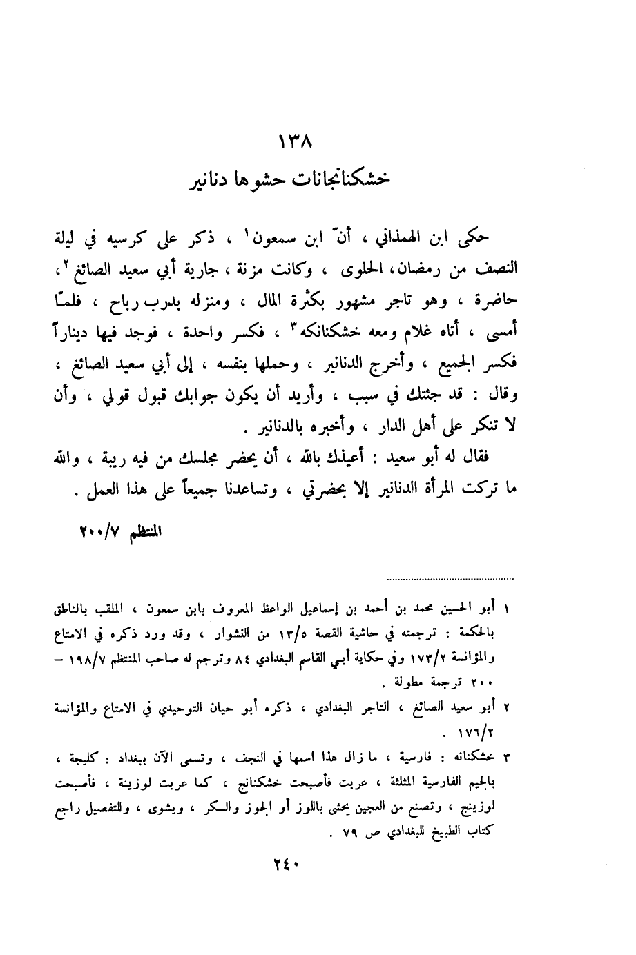 حكى ابن الهمذاني، أنّ ابن سمعون «1» ، ذكر على كرسيه في ليلة النصف من رمضان، الحلوى، وكانت مزنة، جارية أبي سعيد الصائغ «2» ، حاضرة، وهو تاجر مشهور بكثرة المال، ومنزله بدرب رباح، فلمّا أمسى، أتاه غلام ومعه خشكنانكه «3» ، فكسر واحدة، فوجد فيها دينارا فكسر الجميع، وأخرج الدنانير، وحملها بنفسه، إلى أبي سعيد الصائغ، وقال: قد جئتك في سبب، وأريد أن يكون جوابك قبول قولي، وأن لا تنكر على أهل الدار، وأخبره بالدنانير.
