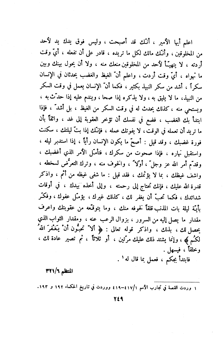 اعلم أيها الأمير، أنّك قد أصبحت، وليس فوق يدك يد لأحد من المخلوقين، وأنّك مالك لكل ما تريده، قادر على أن تفعله، أيّ وقت أردته، لا يتهيّأ لأحد من المخلوقين منعك منه، ولا أن يحول بينك وبين ما تهواه، أيّ وقت أردت، واعلم أنّ الغيظ والغضب يحدثان في الإنسان سكرا، أشد من سكر النبيذ بكثير، فكما أنّ الإنسان يعمل في وقت السكر من النبيذ، ما لا يليق به، ولا يذكره إذا صحا، ويندم عليه إذ احدّث به، ويستحي منه، كذلك يحدث له في وقت السكر من الغيظ، بل أشدّ، فإذا ابتدأ بك الغضب، فضع في نفسك أن تؤخر العقوبة إلى غد، واثقا بأن ما تريد أن تعمله في الوقت، لا يفوتك عمله، فإنّك إذا بتّ ليلتك، سكنت فورة غضبك، وقد قيل: أصحّ ما يكون الإنسان رأيا، إذا استدبر ليله، واستقبل نهاره، فإذا صحوت من سكرك، فتأمّل الأمر الذي أغضبك، وقدّم أمر الله عز وجلّ، أوّلا، والخوف منه، وترك التعرّض لسخطه، واشف غيظك، بما لا يؤثمك، فقد قيل: ما شفى غيظه من أثم، واذكر قدرة الله عليك، فإنك تحتاج إلى رحمته، وإلى أخذه بيدك، في أوقات شدائدك، فكما تحبّ أن يغفر لك، كذلك غيرك، يؤمّل عفوك، وفكّر بأيّة ليلة بات المذنب قلقا لخوفه منك، وما يتوقّعه من عقوبتك واعرف مقدار ما يصل إليه من السرور، بزوال الرعب عنه، ومقدار الثواب الذي يحصل لك، بذلك، واذكر قوله تعالى: أَلا تُحِبُّونَ أَنْ يَغْفِرَ اللَّهُ لَكُمْ
