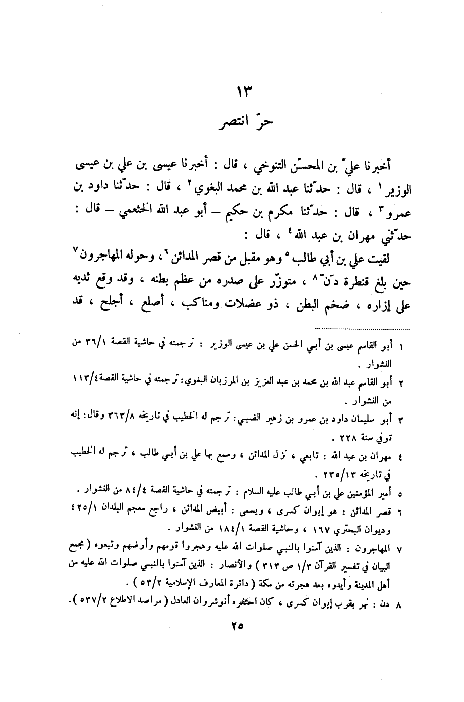 لقيت علي بن أبي طالب «5» وهو مقبل من قصر المدائن «6» ، وحوله المهاجرون «7» حين بلغ قنطرة دنّ «8» ، متوزّر على صدره من عظم بطنه، وقد وقع ثديه على إزاره، ضخم البطن، ذو عضلات ومناكب، أصلع، أجلح، قد