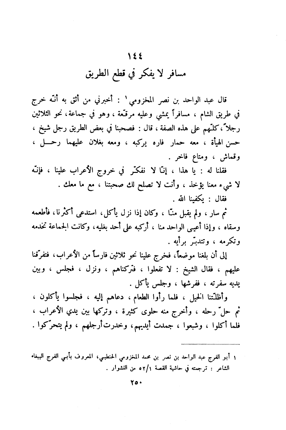 إلى أن بلغنا موضعا، فخرج علينا نحو ثلاثين فارسا من الأعراب، فتفرّقنا عليهم، فقال الشيخ: لا تفعلوا، فتركناهم، ونزل، فجلس، وبين يديه سفرته، ففرشها، وجلس يأكل.