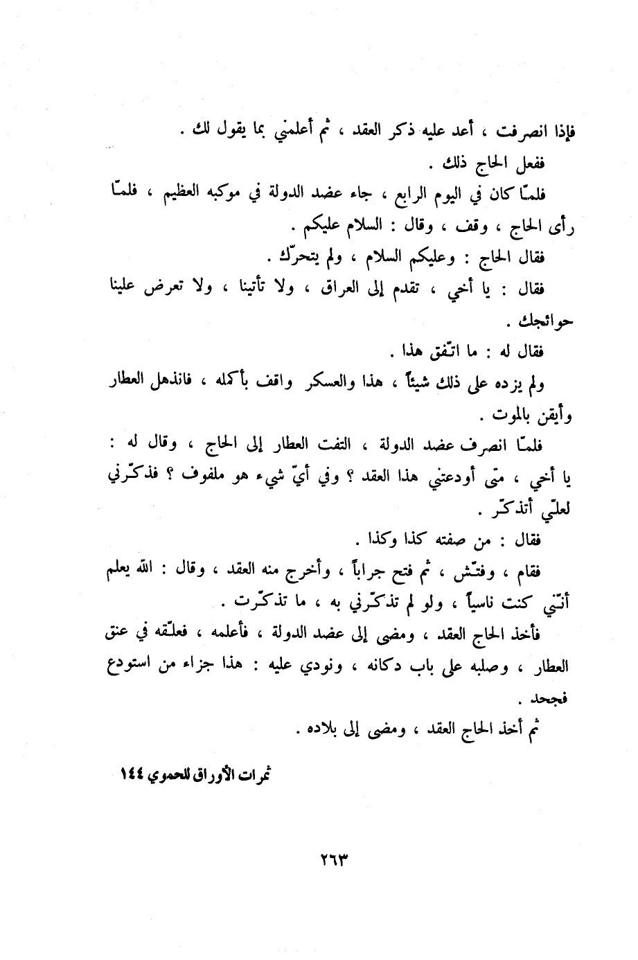 فلمّا انصرف عضد الدولة، التفت العطار إلى الحاج، وقال له: