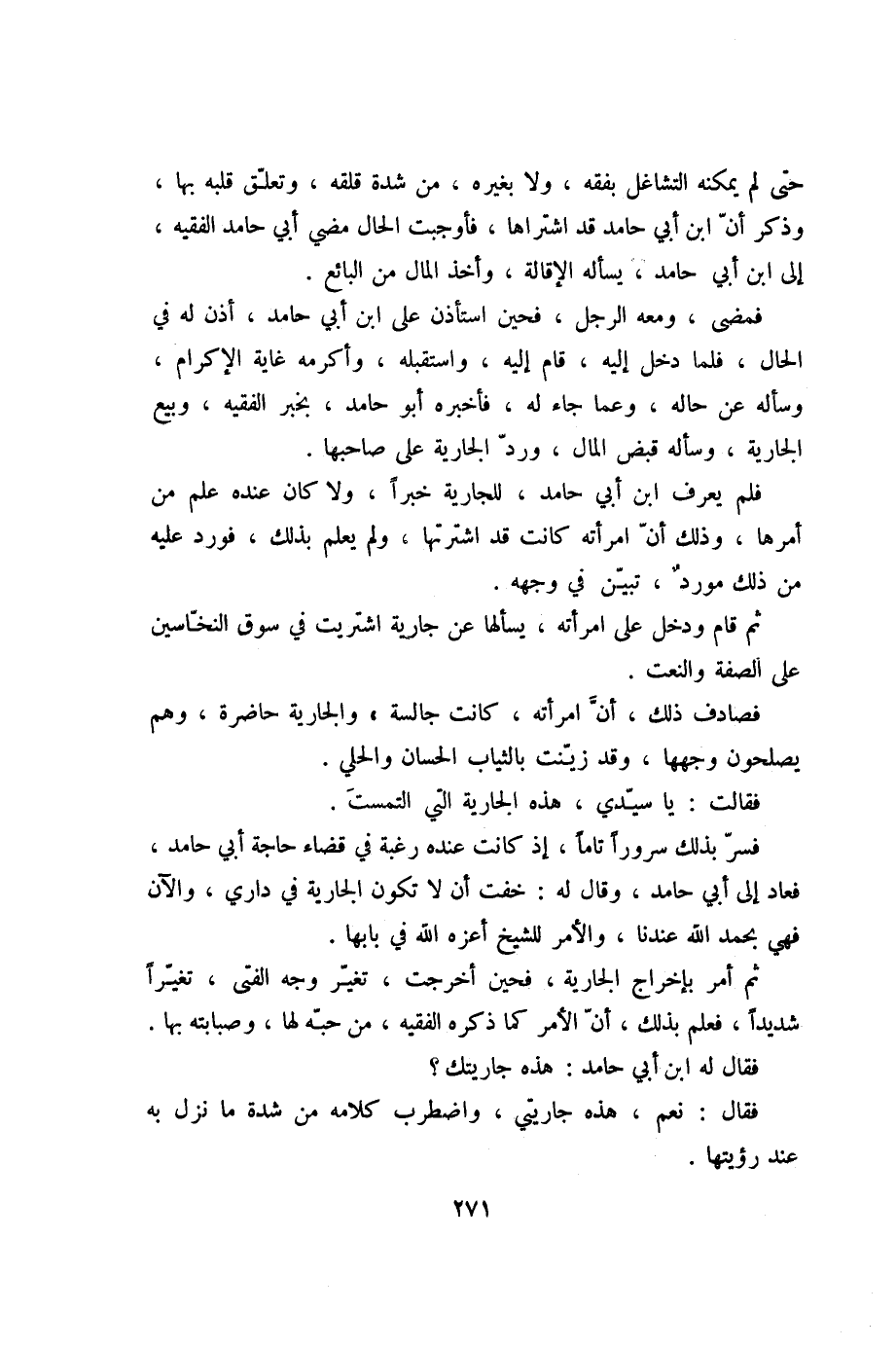 فسرّ بذلك سرورا تاما، إذ كانت عنده رغبة في قضاء حاجة أبي حامد، فعاد إلى أبي حامد، وقال له: خفت أن لا تكون الجارية في داري، والآن فهي بحمد الله عندنا، والأمر للشيخ أعزه الله في بابها.