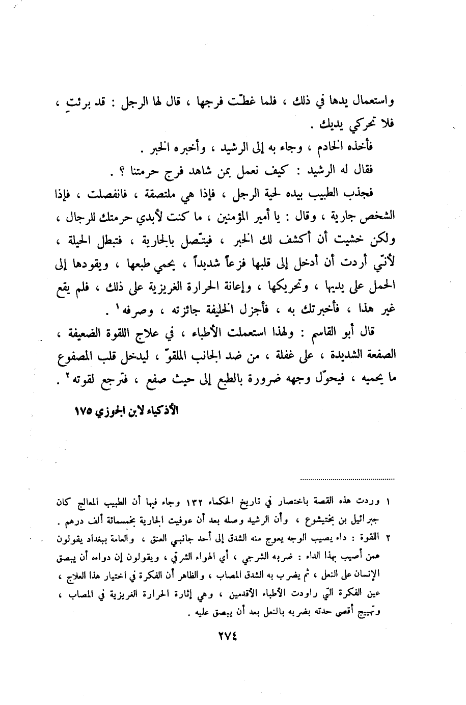 قال أبو القاسم: ولهذا استعملت الأطباء، في علاج اللقوة الضعيفة، الصفعة الشديدة، على غفلة، من ضد الجانب الملقوّ، ليدخل قلب المصفوع ما يحميه، فيحوّل وجهه ضرورة بالطبع إلى حيث صفع، فترجع لقوته «2» الأذكياء لابن الجوزي 175