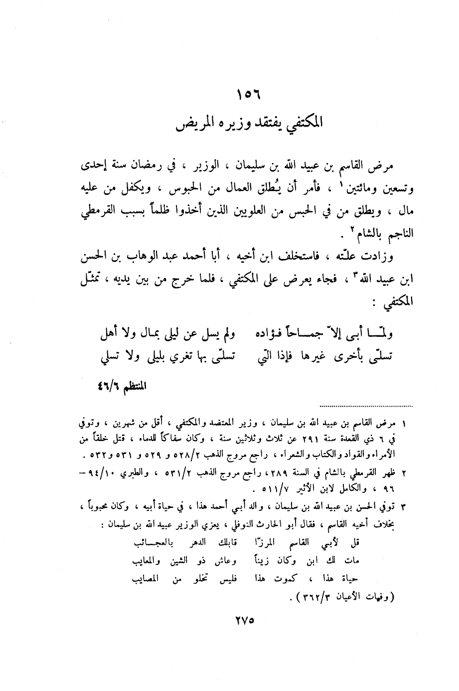 وزادت علّته، فاستخلف ابن أخيه، أبا أحمد عبد الوهاب بن الحسن ابن عبيد الله «3» ، فجاء يعرض على المكتفي، فلما خرج من بين يديه، تمثّل المكتفي: