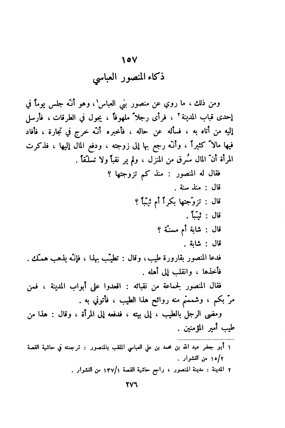 ومن ذلك، ما روي عن منصور بني العباس «1» ، وهو أنّه جلس يوما في إحدى قباب المدينة «2» ، فرأى رجلا ملهوفا، يجول في الطرقات، فأرسل إليه من أتاه به، فسأله عن حاله، فأخبره أنّه خرج في تجارة، فأفاد فيها مالا كثيرا، وأنّه رجع بها إلى زوجته، ودفع المال إليها، فذكرت المرأة أنّ المال سرق من المنزل، ولم ير نقبا ولا تسلّقا.