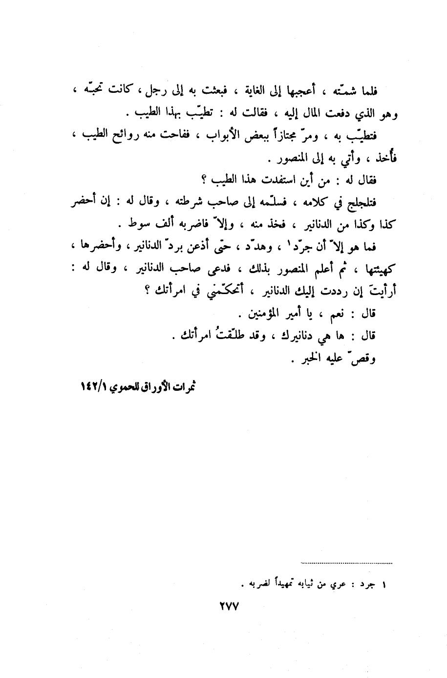 فتلجلج في كلامه، فسلّمه إلى صاحب شرطته، وقال له: إن أحضر كذا وكذا من الدنانير، فخذ منه، وإلّا فاضربه ألف سوط.
