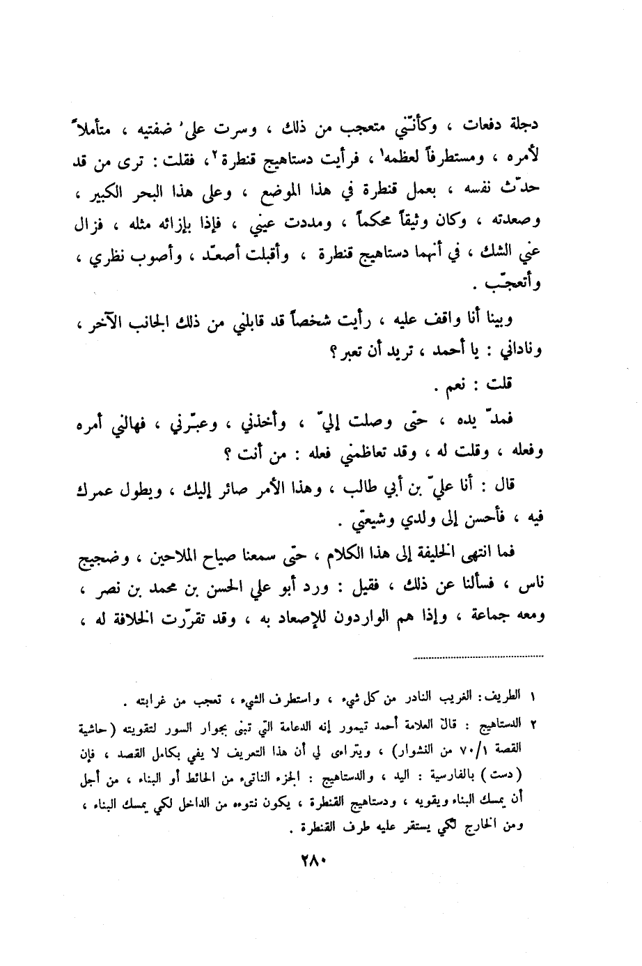 دجلة دفعات، وكأنّني متعجب من ذلك، وسرت على ضفتيه، متأملا لأمره، ومستطرفا لعظمه «1» ، فرأيت دستاهيج قنطرة «2» ، فقلت: ترى من قد حدّث نفسه، بعمل قنطرة في هذا الموضع، وعلى هذا البحر الكبير، وصعدته، وكان وثيقا محكما، ومددت عيني، فإذا بإزائه مثله، فزال عني الشك، في أنهما دستاهيج قنطرة، وأقبلت أصعّد، وأصوب نظري، وأتعجّب.