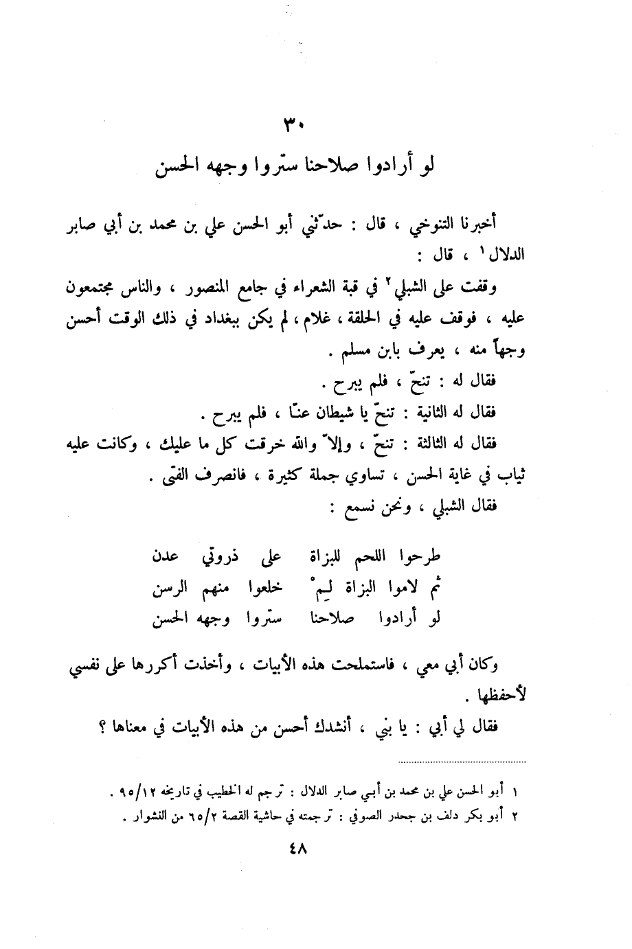 وقفت على الشبلي «2» في قبة الشعراء في جامع المنصور، والناس مجتمعون عليه، فوقف عليه في الحلقة، غلام، لم يكن ببغداد في ذلك الوقت أحسن وجها منه، يعرف بابن مسلم.