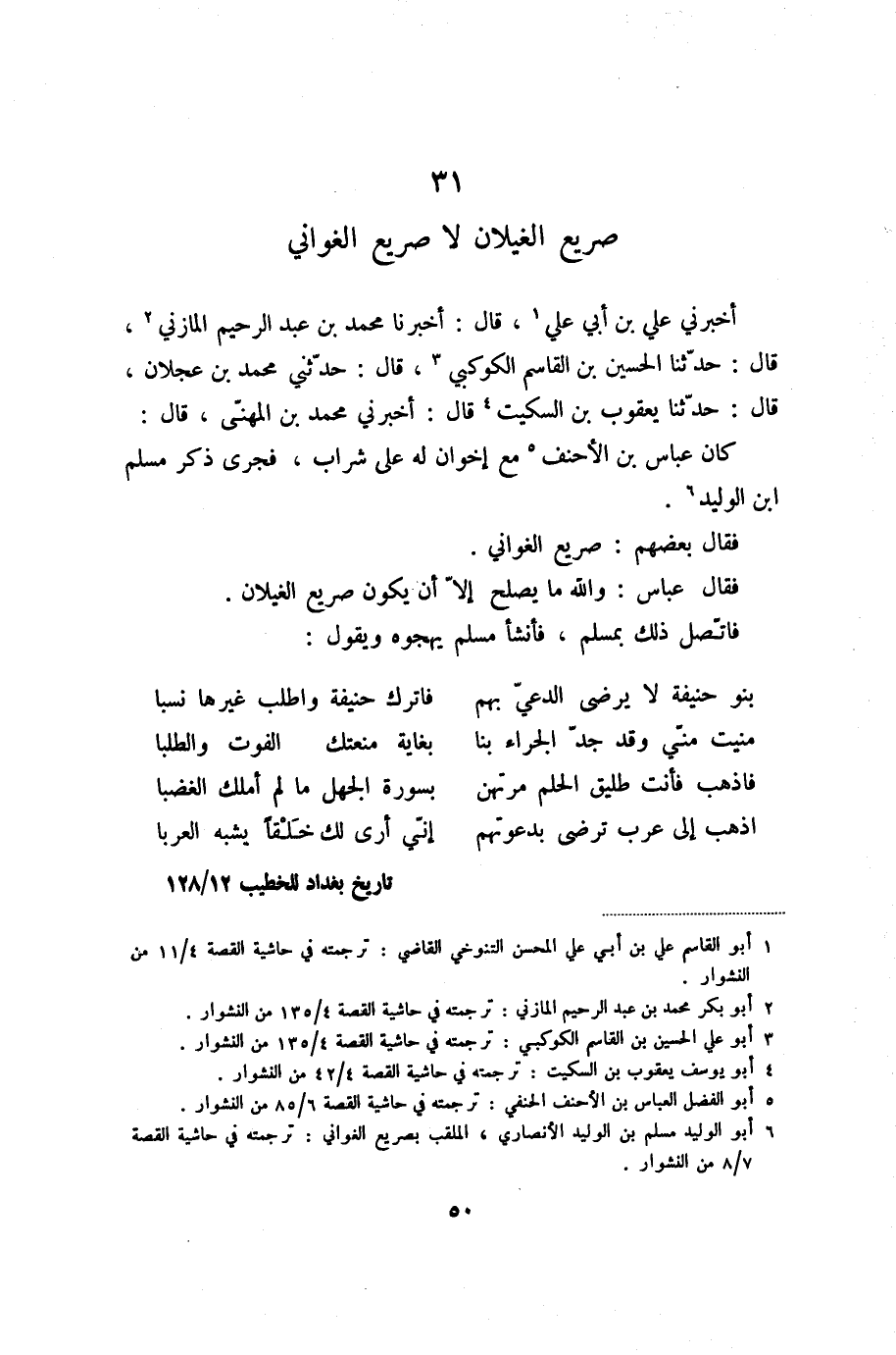 أخبرني علي بن أبي علي «1» ، قال: أخبرنا محمد بن عبد الرحيم المازني «2» ، قال: حدّثنا الحسين بن القاسم الكوكبي «3» ، قال: حدّثني محمد بن عجلان، قال: حدّثنا يعقوب بن السكيت «4» قال: أخبرني محمد بن المهنّى، قال: