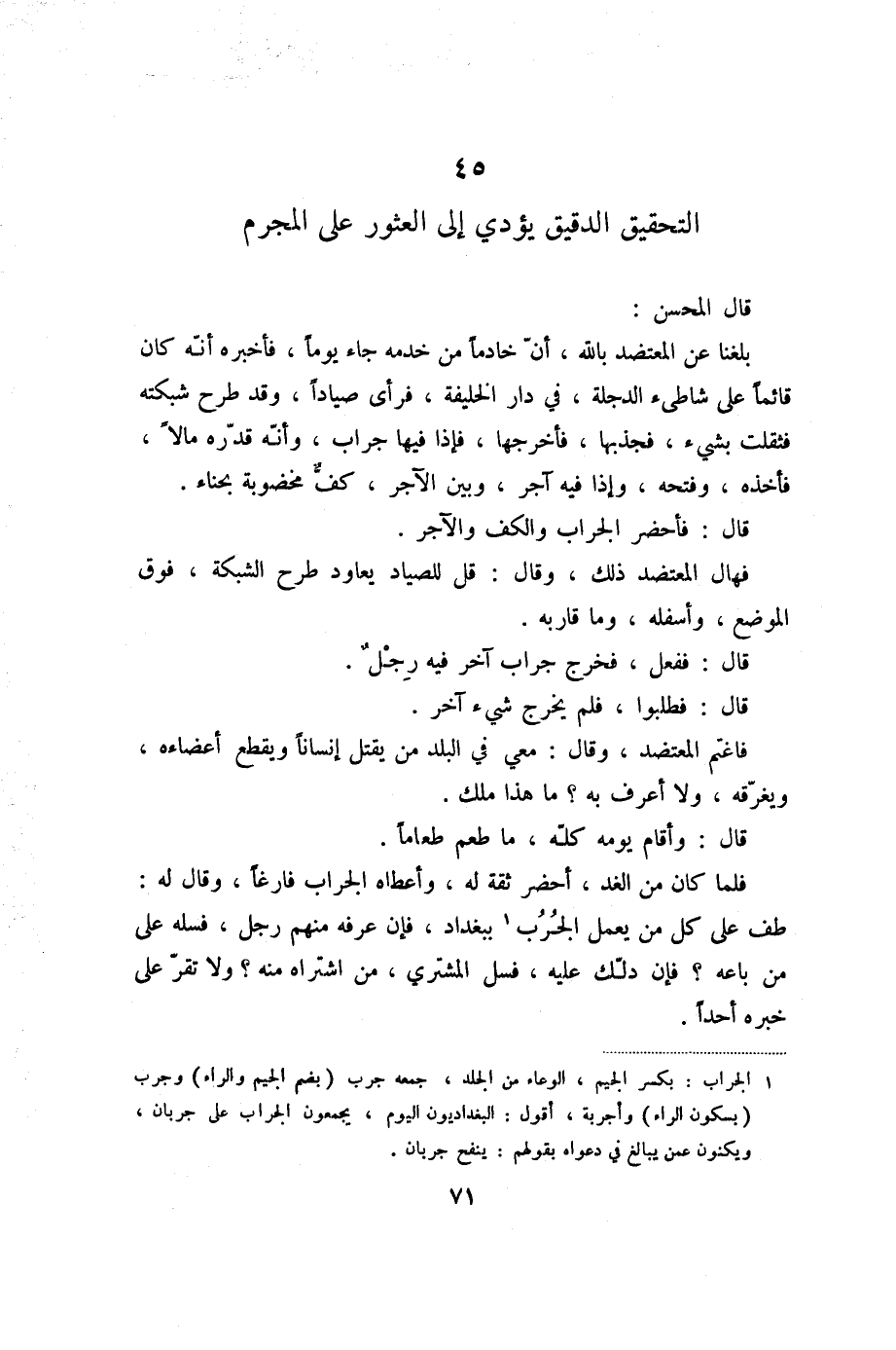 بلغنا عن المعتضد بالله، أنّ خادما من خدمه جاء يوما، فأخبره أنّه كان قائما على شاطىء الدجلة، في دار الخليفة، فرأى صيادا، وقد طرح شبكته فثقلت بشيء، فجذبها، فأخرجها، فإذا فيها جراب، وأنّه قدّره مالا، فأخذه، وفتحه، وإذا فيه آجر، وبين الآجر، كفّ مخضوبة بحناء.