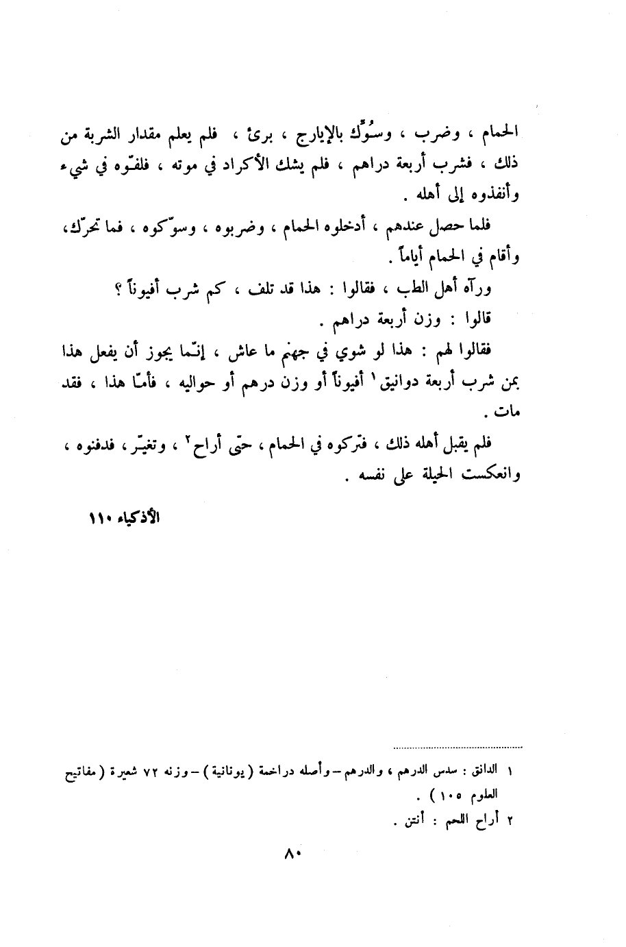 فقالوا لهم: هذا لو شوي في جهنم ما عاش، إنّما يجوز أن يفعل هذا بمن شرب أربعة دوانيق «1» أفيونا أو وزن درهم أو حواليه، فأمّا هذا، فقد مات.