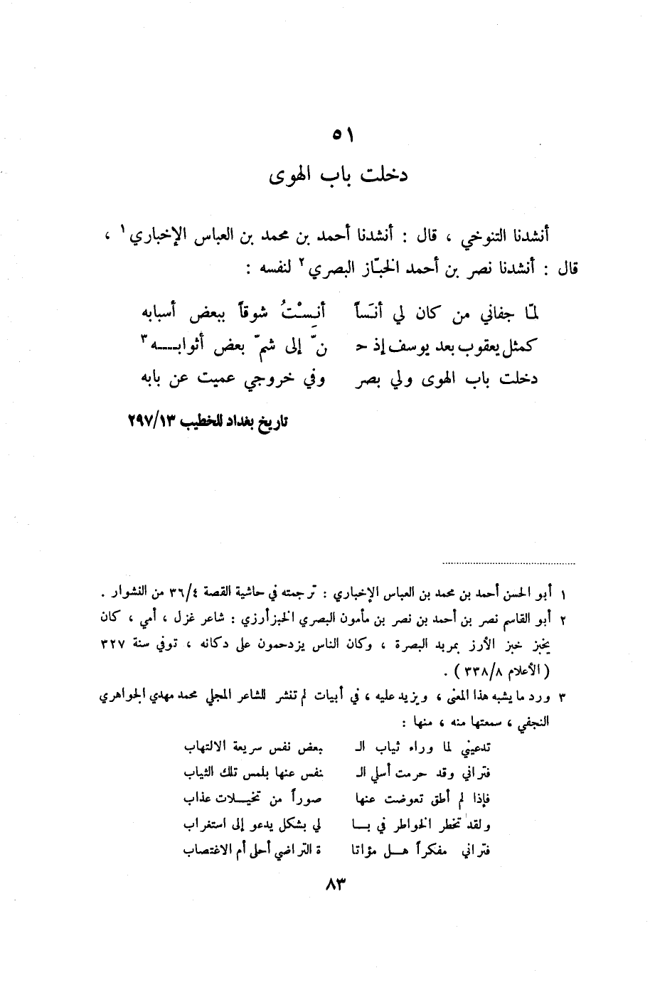 أنشدنا التنوخي، قال: أنشدنا أحمد بن محمد بن العباس الإخباري «1» ، قال: أنشدنا نصر بن أحمد الخبّاز البصري «2» لنفسه: