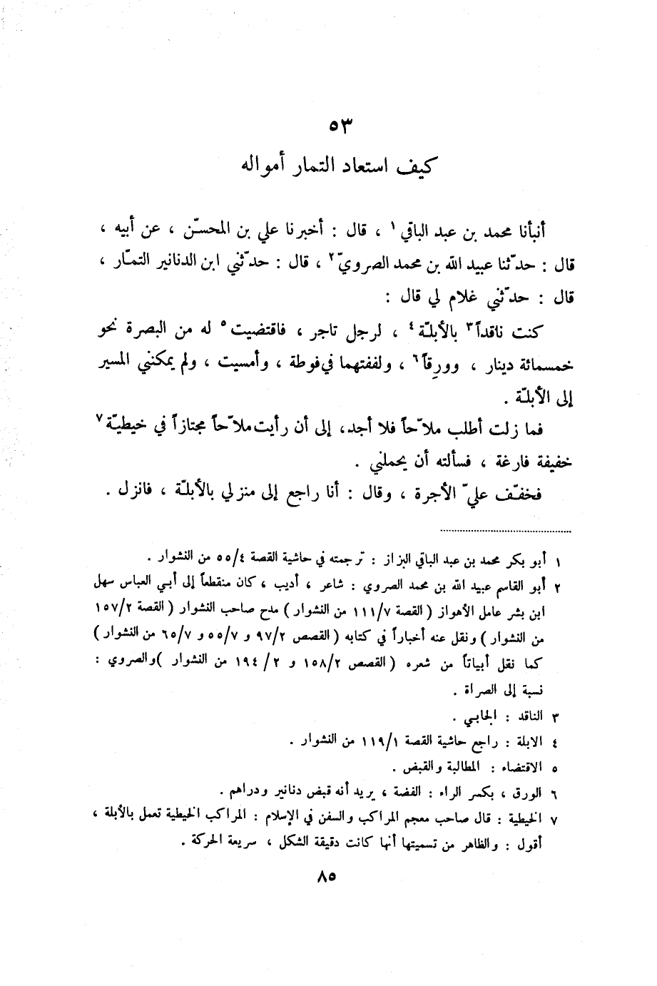 كنت ناقدا «3» بالأبلّة «4» ، لرجل تاجر، فاقتضيت «5» له من البصرة نحو خمسمائة دينار، وورقا «6» ، ولففتهما في فوطة، وأمسيت، ولم يمكنني المسير إلى الأبلّة.
