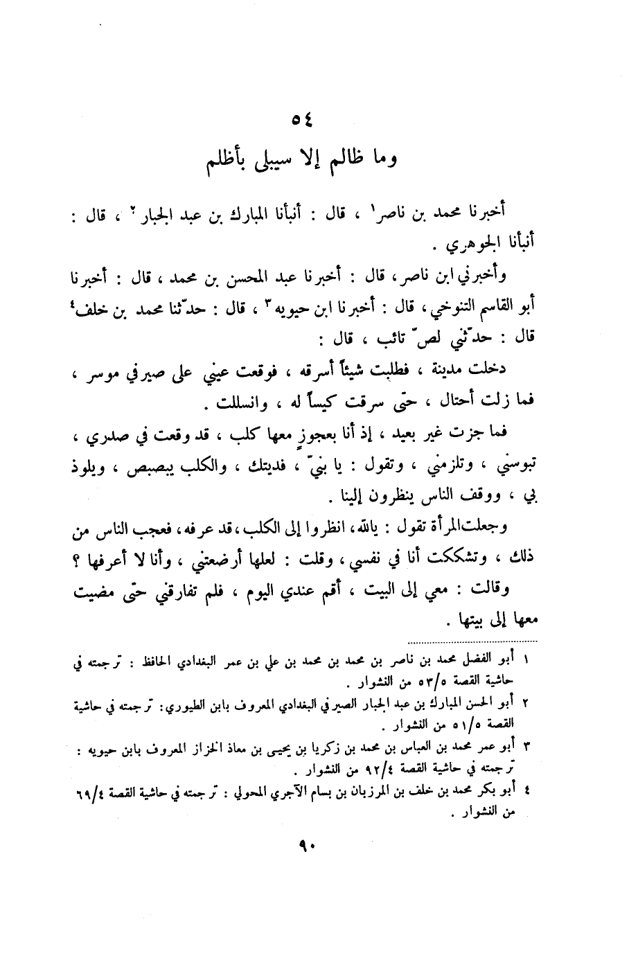 وأخبرني ابن ناصر، قال: أخبرنا عبد المحسن بن محمد، قال: أخبرنا أبو القاسم التنوخي، قال: أخبرنا ابن حيويه «3» ، قال: حدّثنا محمد بن خلف «4» قال: حدّثني لصّ تائب، قال: