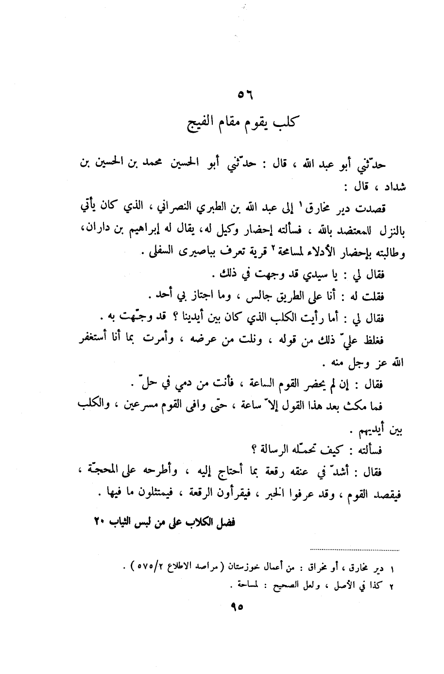 قصدت دير مخارق «1» إلى عبد الله بن الطبري النصراني، الذي كان يأتي بالنزل للمعتضد بالله، فسألته إحضار وكيل له، يقال له إبراهيم بن داران، وطالبته بإحضار الأدلاء لمسامحة «2» قرية تعرف بباصيرى السفلى.