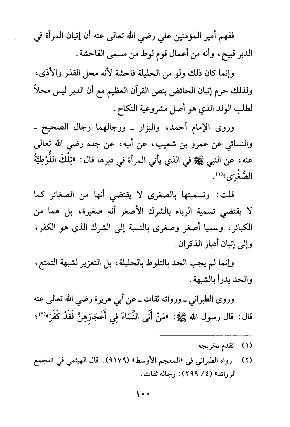 وروى الطبراني - ورواته ثقات - عن أبي هريرة رضي الله تعالى عنه قال: قال رسول الله - صلى الله عليه وسلم -: "مَنْ أتَى النِّسَاءَ فِي أَعْجَازِهِنَّ فَقَدْ كَفَرَ" (¬2)؛