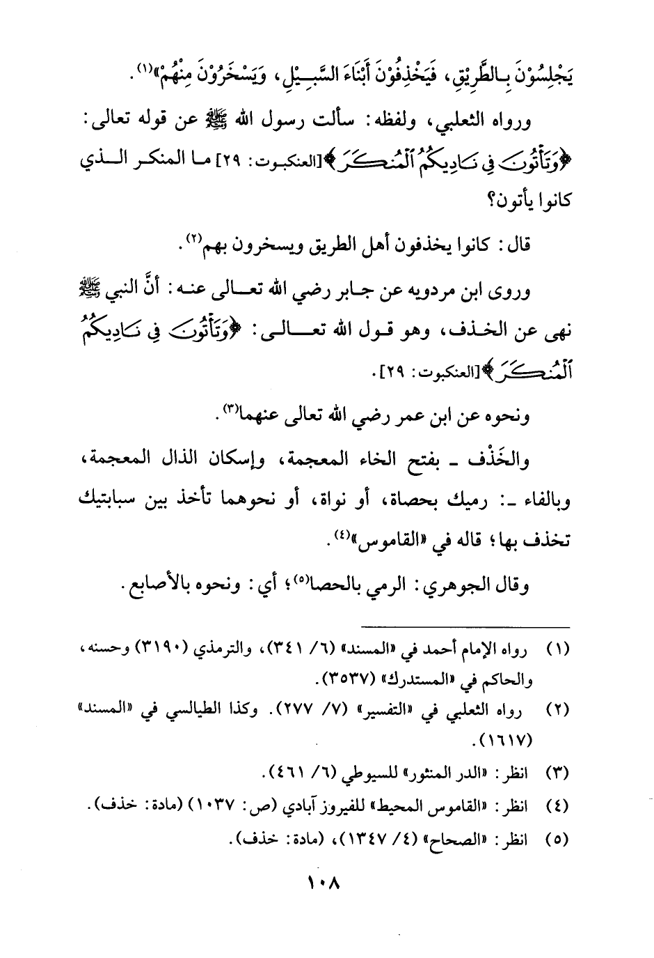 وروى ابن مردويه عن جابر رضي الله تعالى عنه: أنَّ النبي - صلى الله عليه وسلم - نهى عن الخذف، وهو قول الله تعالى: {وَتَأْتُونَ فِي نَادِيكُمُ الْمُنْكَرَ} [العنكبوت: 29].