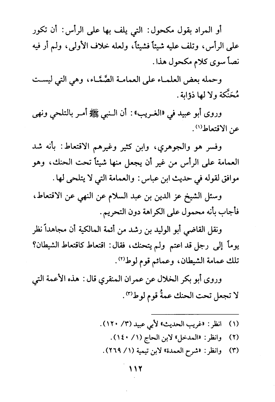 وروى أبو بكر الخلال عن عمران المنقري قال: هذه الأعمة التي لا تجعل تحت الحنك عمةُ قوم لوط (¬3).