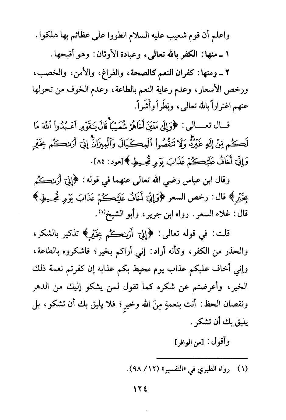 وقال ابن عباس رضي الله تعالى عنهما في قوله: {إِنِّي أَرَاكُمْ بِخَيْر} قال: رخص السعر {وَإِنِّي أَخَافُ عَلَيْكُمْ عَذَابَ يَوْمٍ مُحِيطٍ} [هود: 84] قال: غلاء السعر. رواه ابن جرير، وأبو الشيخ (¬1).