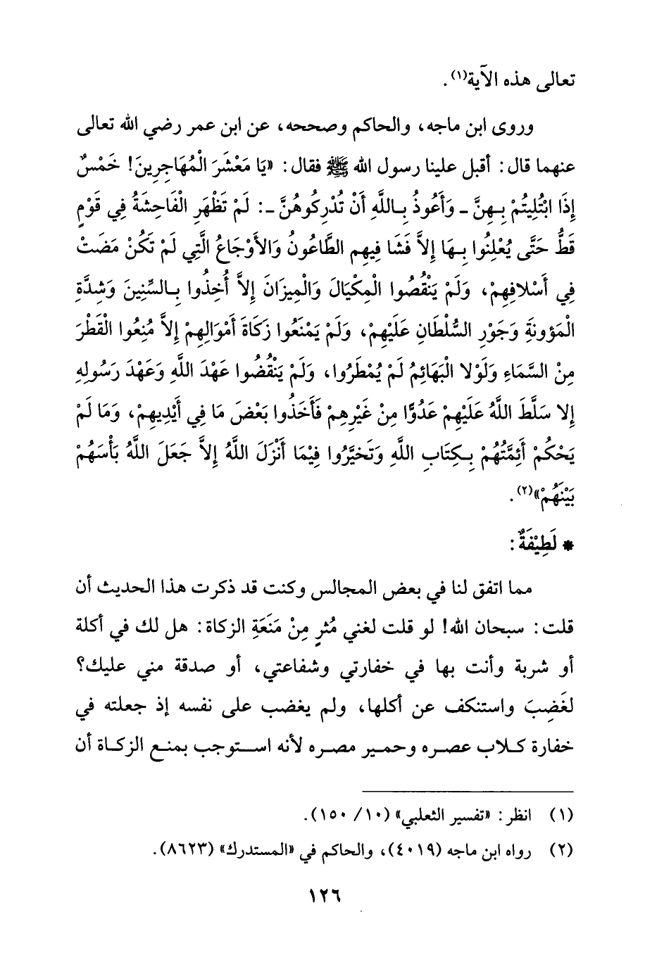 وروى ابن ماجه، والحاكم وصححه، عن ابن عمر رضي الله تعالى عنهما قال: أقبل علينا رسول الله - صلى الله عليه وسلم - فقال: "يَا مَعْشَرَ الْمُهَاجِرِينَ! خَمْسٌ إِذَا ابْتُلِيتُمْ بِهِنَّ - وَأَعُوذُ بِاللَّهِ أَنْ تُمْرِكُوهُنَّ -: لَمْ تَظْهَرِ الْفَاحِشَةُ فِي قَوْمٍ قَطُّ حَتَّى يُعْلِنُوا بِهَا إِلاَّ فَشَا فِيهِم الطَّاعُونُ وَالأَوْجَاعُ الَّتِي لَمْ تَكُنْ مَضَتْ فِي أَسْلافِهِمْ، وَلَمْ يَنْقُصُوا الْمِكْيَالَ وَالْمِيزَانَ إِلاَّ أُخِذُوا بِالسِّنِينَ وَشِدَّةِ الْمَؤونَةِ وَجَوْرِ السُّلْطَانِ عَلَيْهِمْ، وَلَمْ يَمْنَعُوا ركَاةَ أَمْوَالِهِمْ إِلاَّ مُنِعُوا الْقَطْرَ مِنْ السَّمَاءِ وَلَوْلا الْبَهَائِمُ لَمْ يُمْطَرُوا، وَلَمْ يَنْقُضُوا عَهْدَ اللَّهِ وَعَهْدَ رَسُولهِ إِلا سَلَّطَ اللهُ عَلَيْهِمْ عَدُوًّا مِنْ غَيْرِهِمْ فَأخَذوا بَعْضَ مَا فِي أَيْدِيهِمْ، وَمَا لَمْ يَحْكُمْ أَئِمَّتُهُمْ بِكِتَابِ اللَّهِ وَتَخيَّرُوا فِيْمَا أَنْزَلَ اللَّهُ إِلاَّ جَعَلَ اللَّهُ بَأْسَهُمْ بَيْنَهُمْ" (¬2).