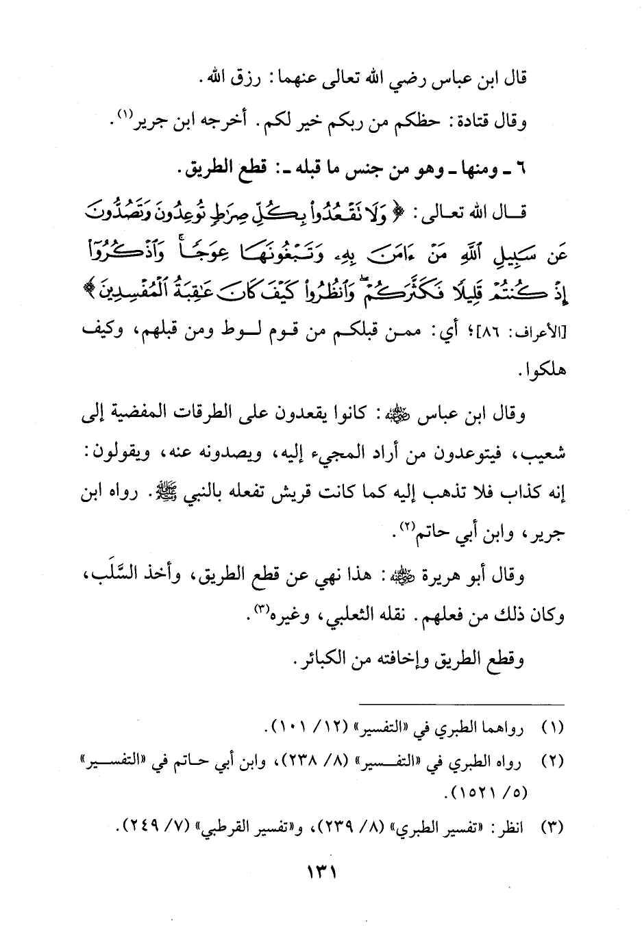 وقال أبو هريرة - رضي الله عنه -: هذا نهي عن قطع الطريق، وأخذ السَّلَب، وكان ذلك من فعلهم. نقله الثعلبي، وغيره (¬3).