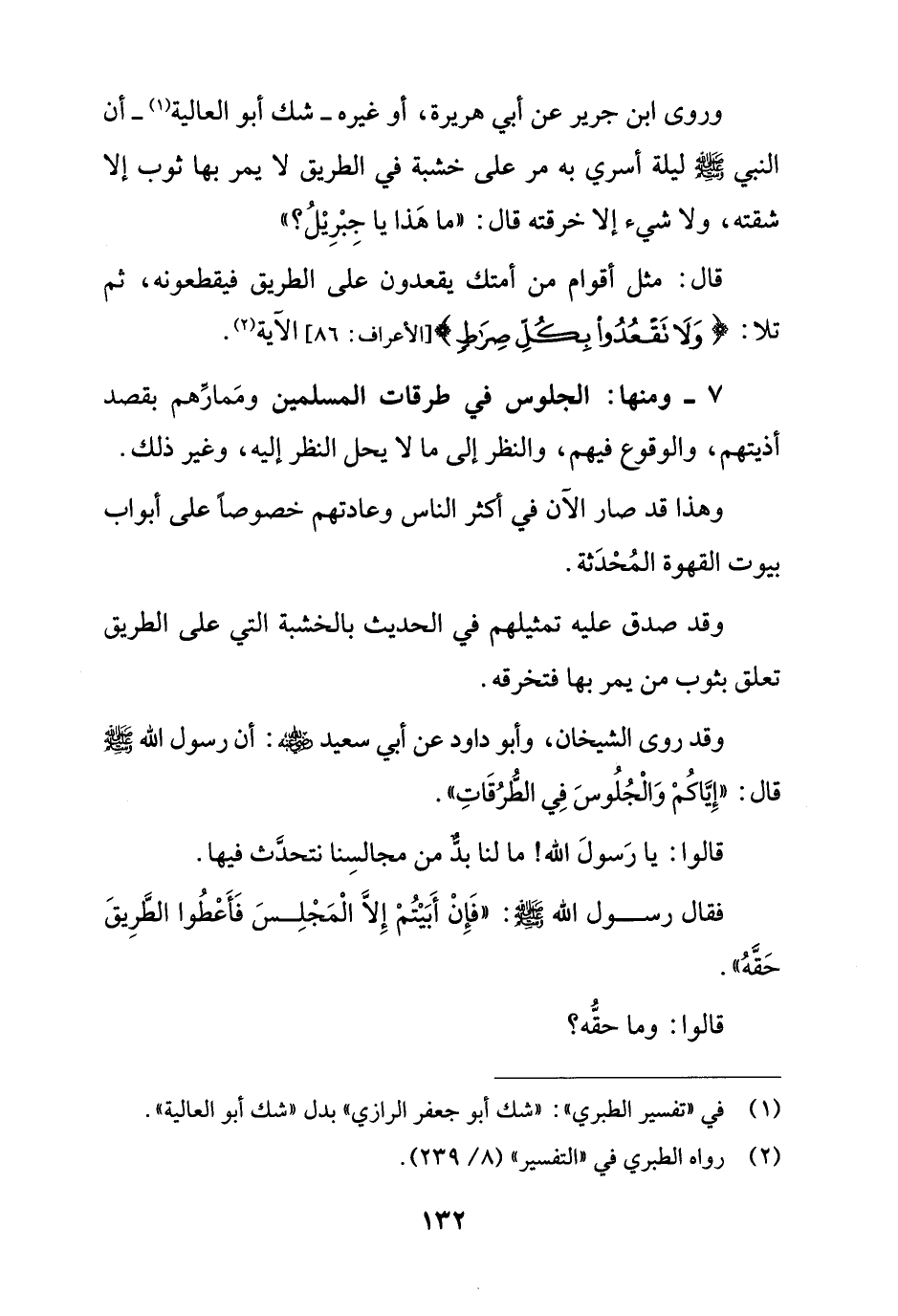 7 - ومنها: الجلوس في طرقات المسلمين ومَمارِّهم بقصد أذيتهم، والوقوع فيهم، والنظر إلى ما لا يحل النظر إليه، وغير ذلك.