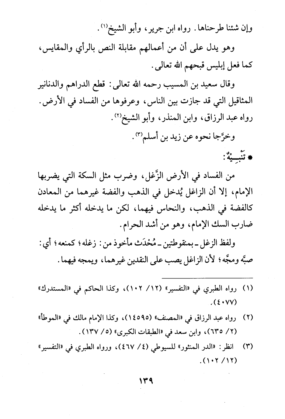 وقال سعيد بن المسيب رحمه الله تعالى: قطع الدراهم والدنانير المثاقيل التي قد جازت بين الناس، وعرفوها من الفساد في الأرض. رواه عبد الرزاق، وابن المنذر، وأبو الشيخ (¬2).