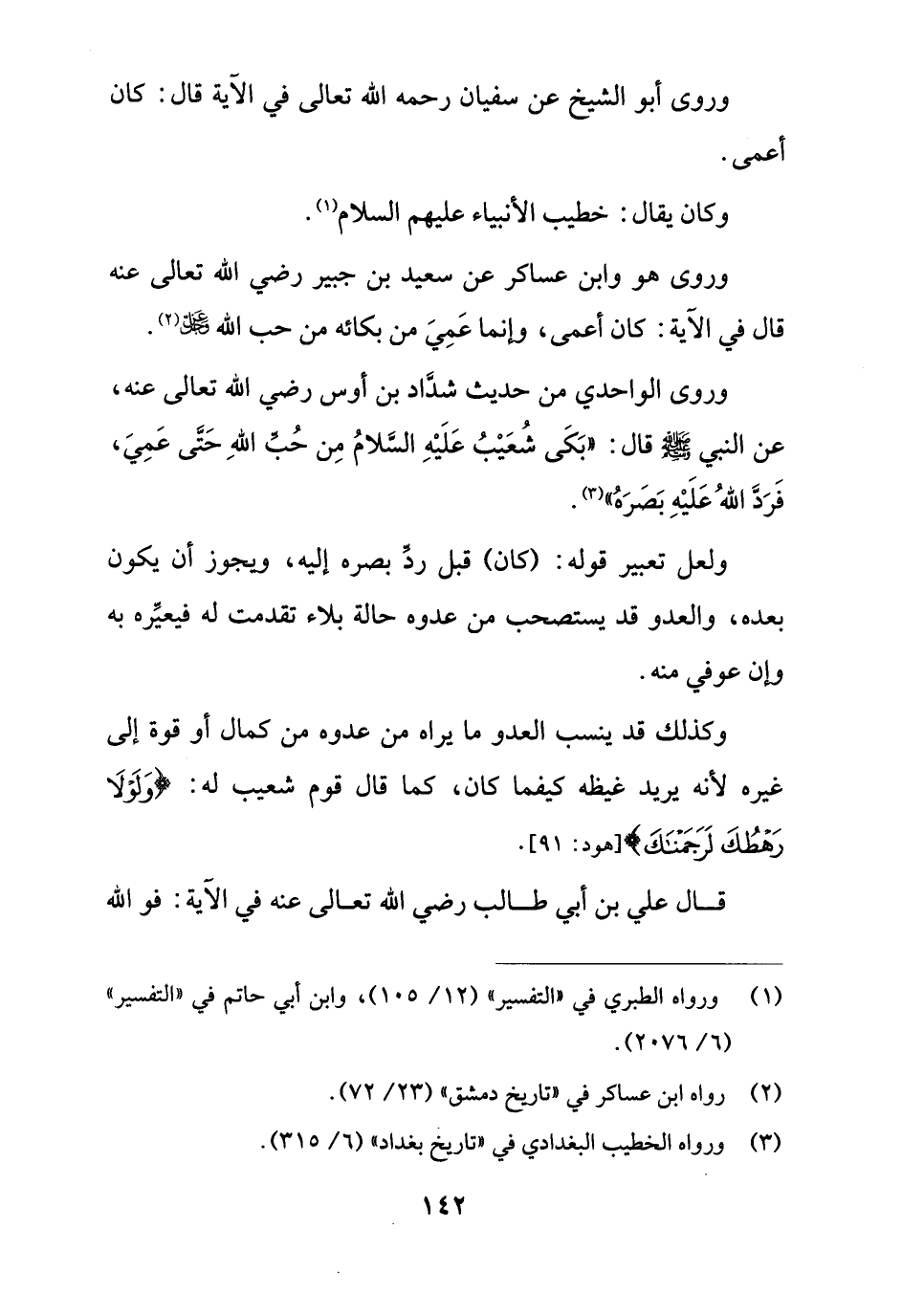 وروى الواحدي من حديث شدَّاد بن أوس رضي الله تعالى عنه، عن النبي - صلى الله عليه وسلم - قال: "بَكَى شُعَيْبُ عَلَيْهِ السَّلامُ مِن حُبِّ اللهِ حَتَّى عَمِيَ، فَردَّ اللهُ عَلَيْهِ بَصَرَهُ" (¬3).
