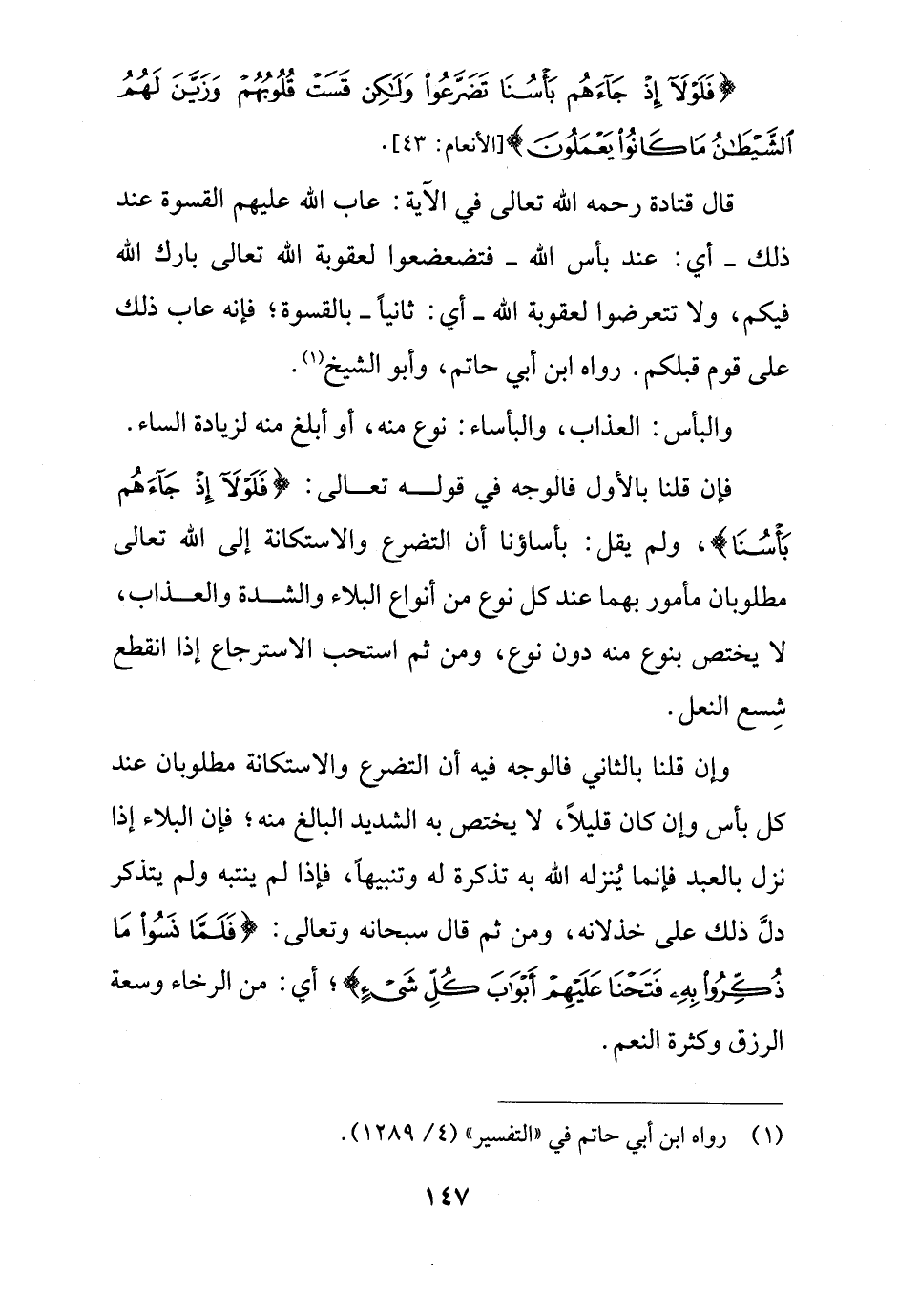 وإن قلنا بالثاني فالوجه فيه أن التضرع والاستكانة مطلوبان عند كل بأس وإن كان قليلاً، لا يختص به الشديد البالغ منه؛ فإن البلاء إذا نزل بالعبد فإنما يُنزله الله به تذكرة له وتنبيهاً، فإذا لم ينتبه ولم يتذكر دلَّ ذلك على خذلانه، ومن ثم قال سبحانه وتعالى: {فَلَمَّا نَسُوا مَا ذُكِّرُوا بِهِ فَتَحْنَا عَلَيْهِمْ أَبْوَابَ كُلِّ شَيْءٍ}؛ أي: من الرخاء وسعة الرزق وكثرة النعم.