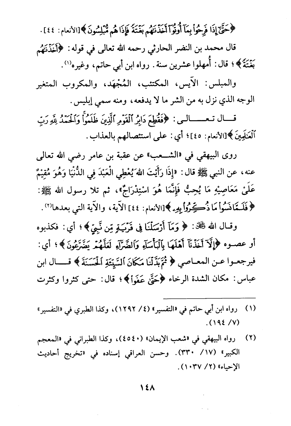 روى البيهقي في "الشعب" عن عقبة بن عامر رضي الله تعالى عنه، عن النبي - صلى الله عليه وسلم - قال: "إِذَا رَأَيْتَ اللهَ يُعْطِي الْعَبْدَ فِي الدُّنْيَا وَهُوَ مُقِيْمٌ عَلَىْ مَعَاصِيْهِ مَا يُحِبُّ فَإنَّمَا هُوَ اسْتِدرَاجٌ"، ثم تلا رسول الله - صلى الله عليه وسلم -: {فَلَمَّا نَسُوا مَا ذُكِّرُوا بِهِ} [الأنعام: 44]، الآية، والآية التي بعدها (¬2).