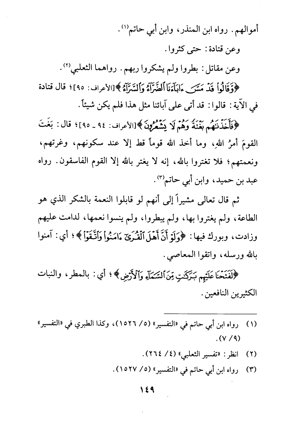 {فَأَخَذْنَاهُمْ بَغْتَةً وَهُمْ لَا يَشْعُرُونَ} [الأعراف: 94 - 95]؛ قال: بَغَتَ القومَ أمرُ اللهِ، وما أخذ الله قوماً قط إلا عند سكونهم، وغرتهم، ونعمتهم؛ فلا تغتروا بالله، إنه لا يغتر بالله إلا القوم الفاسقون. رواه عبد بن حميد، وابن أبي حاتم (¬3).