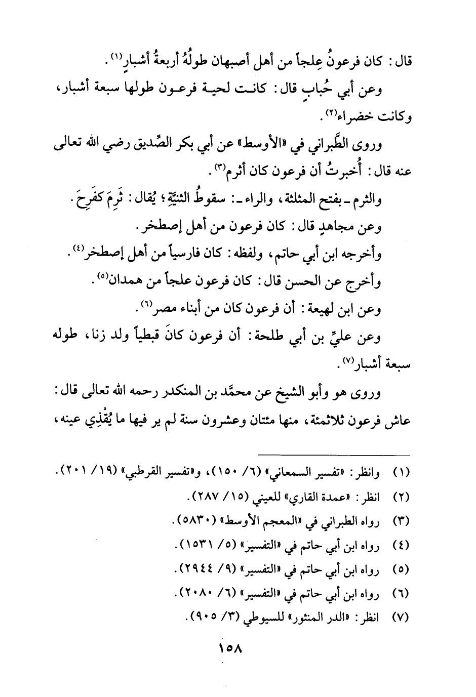 قال: كان فرعونُ عِلجاً من أهل أصبهان طولُهُ أربعةُ أشبارٍ (¬1).
