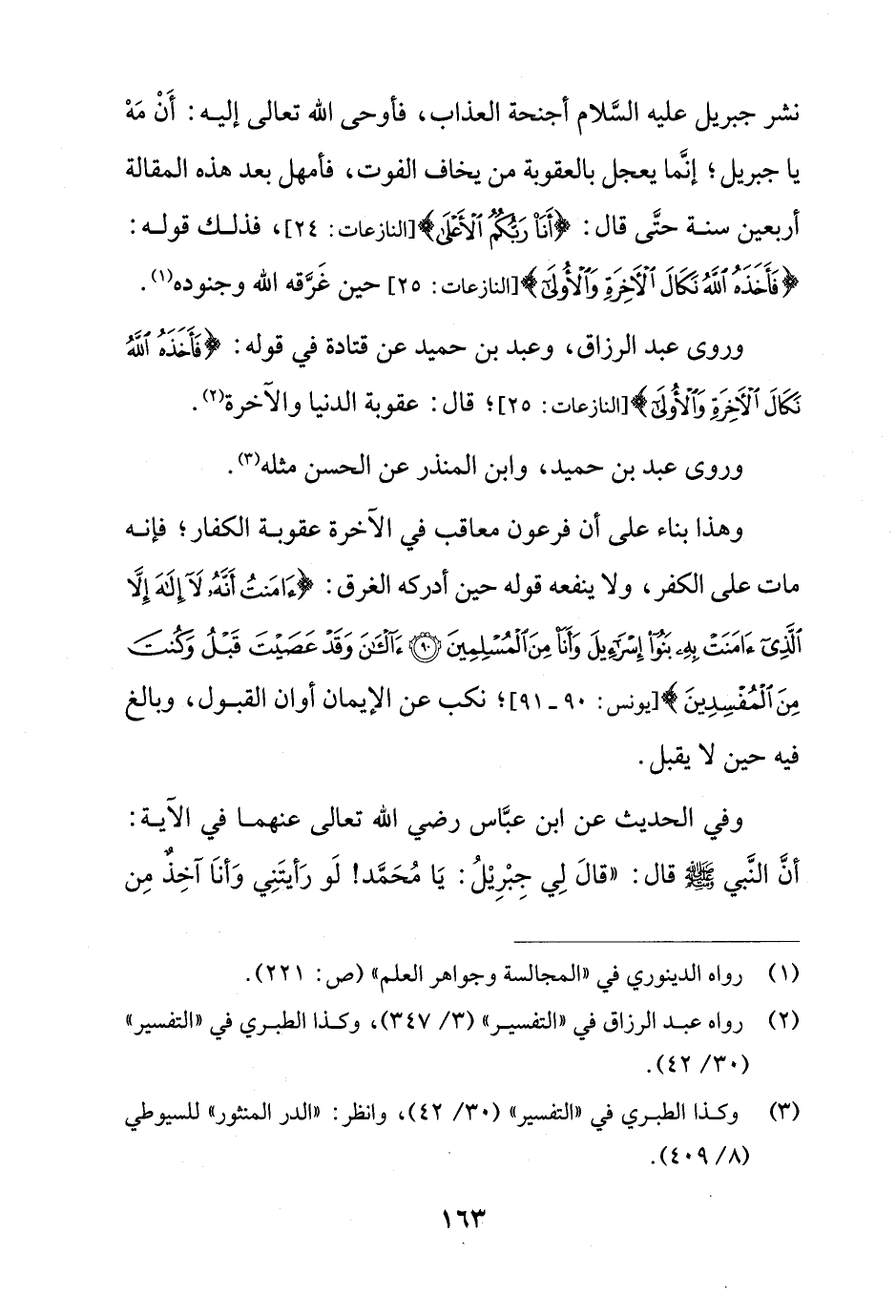 نشر جبريل عليه السَّلام أجنحة العذاب، فأوحى الله تعالى إليه: أَنْ مَهْ يا جبريل؛ إنَّما يعجل بالعقوبة من يخاف الفوت، فأمهل بعد هذه المقالة أربعين سنة حتَّى قال: {فَقَالَ أَنَا رَبُّكُمُ الْأَعْلَى} [النازعات: 24]، فذلك قوله: {فَأَخَذَهُ اللَّهُ نَكَالَ الْآخِرَةِ وَالْأُولَى} [النازعات: 25] حين غَرَّقه الله وجنوده (¬1).