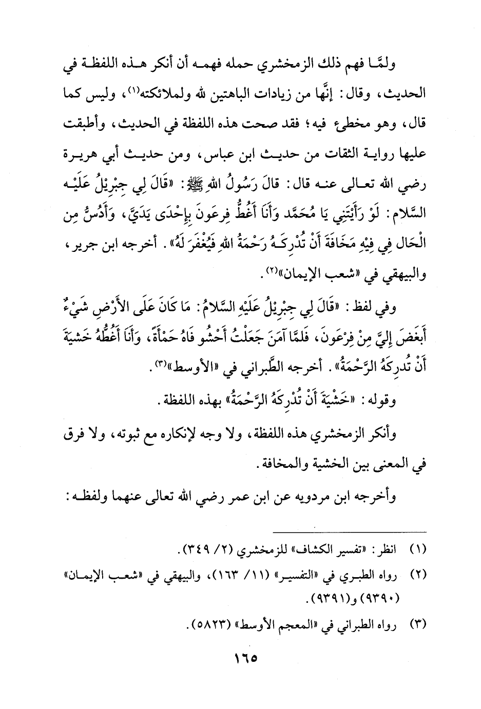 ولمَّا فهم ذلك الزمخشري حمله فهمه أن أنكر هذه اللفظة في الحديث، وقال: إنَّها من زيادات الباهتين لله ولملائكته (¬1)، وليس كما قال، وهو مخطئ فيه؛ فقد صحت هذه اللفظة في الحديث، وأطبقت عليها رواية الثقات من حديث ابن عباس، ومن حديث أبي هريرة رضي الله تعالى عنه قال: قالَ رَسُولُ اللهِ - صلى الله عليه وسلم -. "قَالَ لِي جِبْرِيْلُ عَلَيْه السَّلام: لَوْ رَأَيْتَنِي يَا مُحَمَّد وَأَنَا أَغُطُّ فِرعَونَ بِإِحْدَى يَدَيَّ، وَأَدُسُّ مِن الْحَال فِي فِيْهِ مَخَافَةَ أَنْ تُدْرِكَهُ رَحْمَةُ اللهِ فَيُغْفَرَ لَه". أخرجه ابن جرير، والبيهقي في "شعب الإيمان" (¬2).