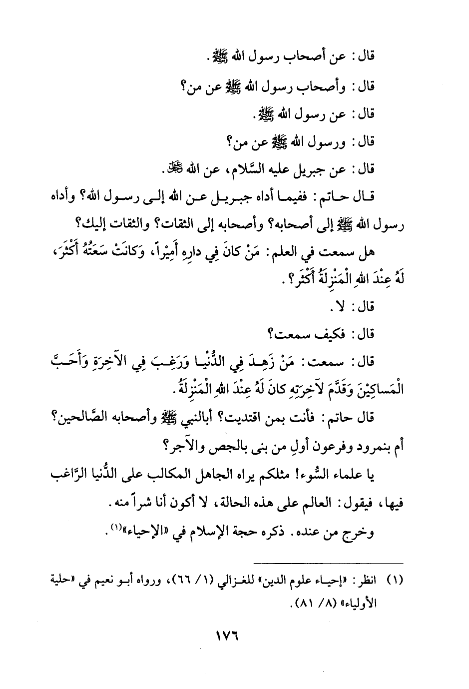 قال حاتم: ففيما أداه جبريل عن الله إلى رسول الله؟ وأداه رسول الله - صلى الله عليه وسلم - إلى أصحابه؛ وأصحابه إلى الثقات؟ والثقات إليك؟