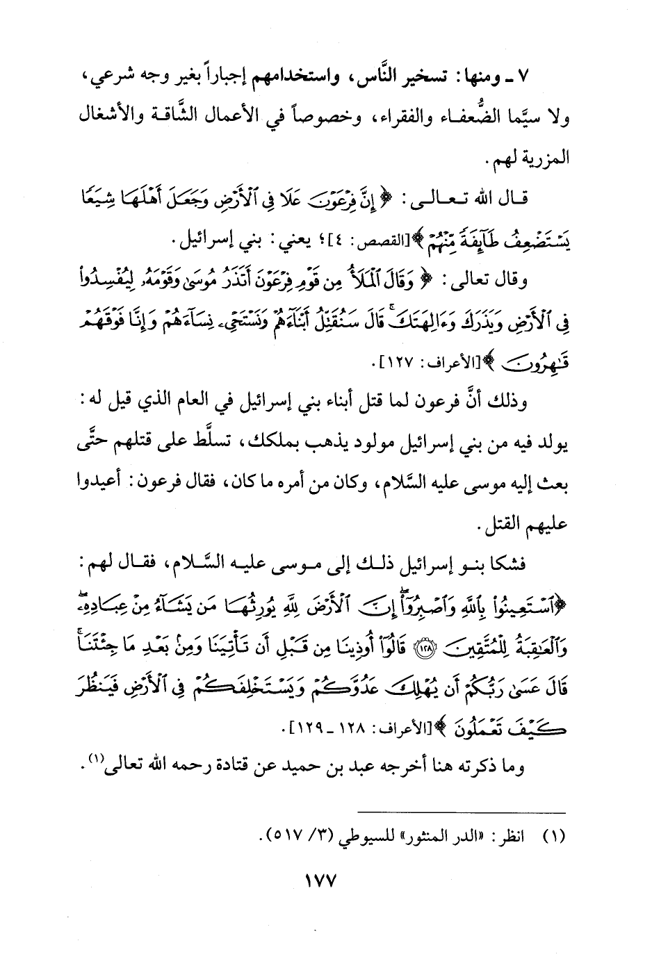 7 - ومنها: تسخير النَّاس، واستخدامهم إجباراً بغير وجه شرعي، ولا سيَّما الضُّعفاء والفقراء، وخصوصاً في الأعمال الشَّاقة والأشغال المزرية لهم.