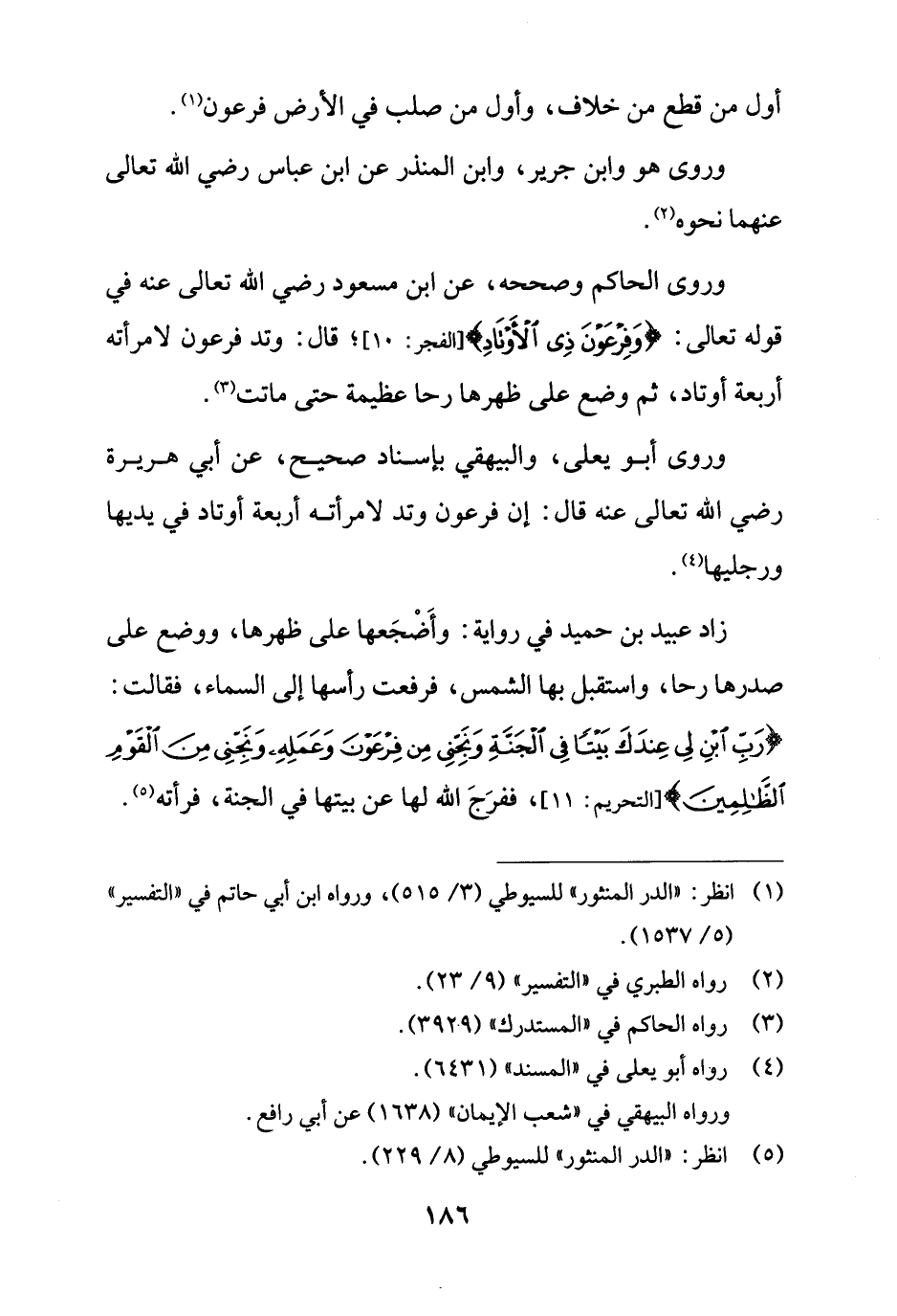 وروى الحاكم وصححه، عن ابن مسعود رضي الله تعالى عنه في قوله تعالى: {وَفِرْعَوْنَ ذِي الْأَوْتَادِ} [الفجر: 10]؛ قال: وتد فرعون لامرأته أربعة أوتاد، ثم وضع على ظهرها رحا عظيمة حتى ماتت (¬3).