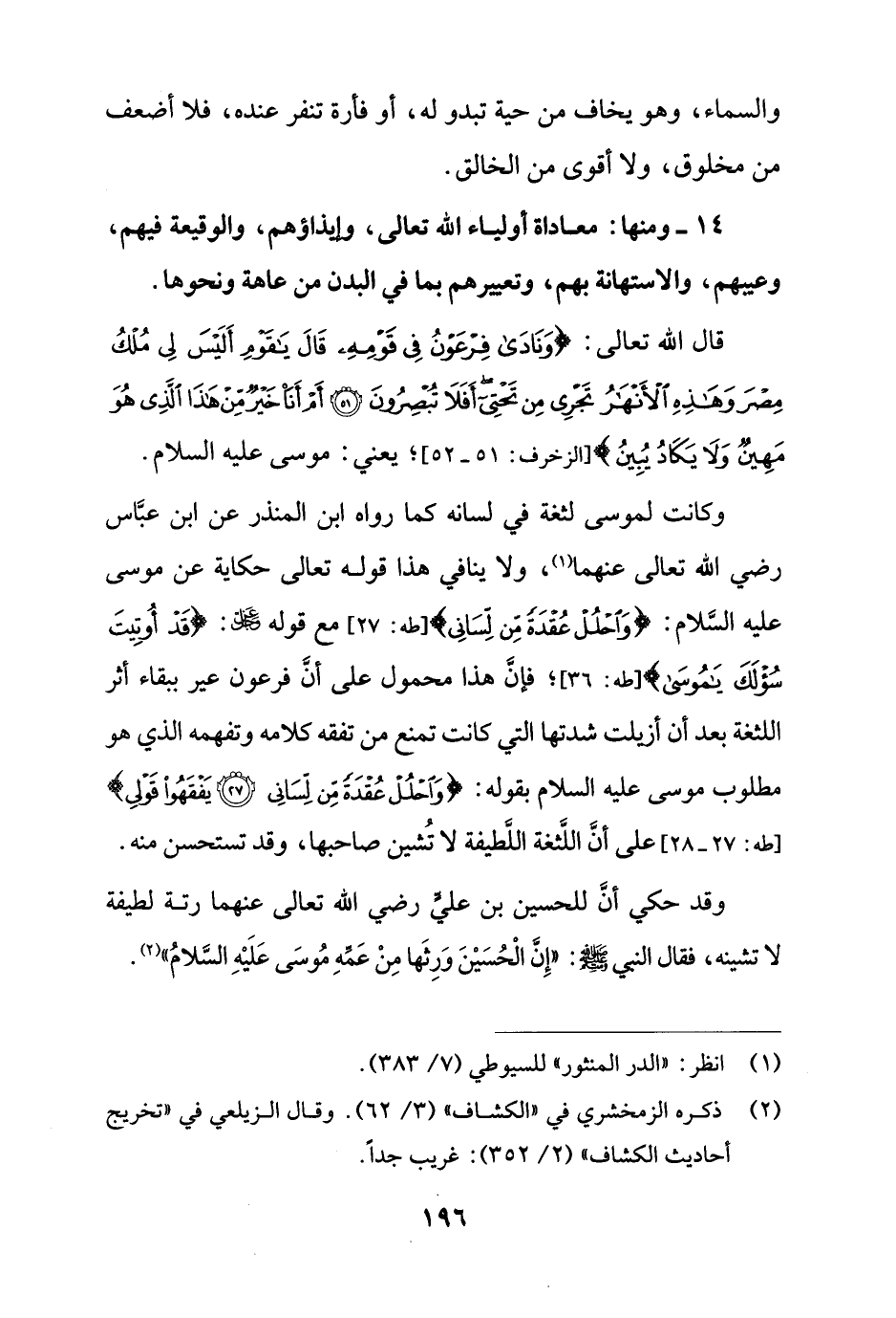 وكانت لموسى لثغة في لسانه كما رواه ابن المنذر عن ابن عبَّاس رضي الله تعالى عنهما (¬1)، ولا ينافي هذا قوله تعالى حكاية عن موسى عليه السَّلام: {وَاحْلُلْ عُقْدَةً مِنْ لِسَانِي} [طه: 27]، مع قوله - عز وجل -: {قَدْ أُوتِيتَ سُؤْلَكَ يَا مُوسَى} [طه: 36]؛ فإنَ هذا محمول على أنَّ فرعون عير ببقاء أثر اللثغة بعد أن أزيلت شدتها التي كانت تمنع من تفقه كلامه وتفهمه الذي هو مطلوب موسى عليه السلام بقوله: {وَاحْلُلْ عُقْدَةً مِنْ لِسَانِي (27) يَفْقَهُوا قَوْلِي} [طه: 27، 28] على أنَّ اللَّثغة اللَّطيفة لا تُشين صاحبها، وقد تستحسن منه.
