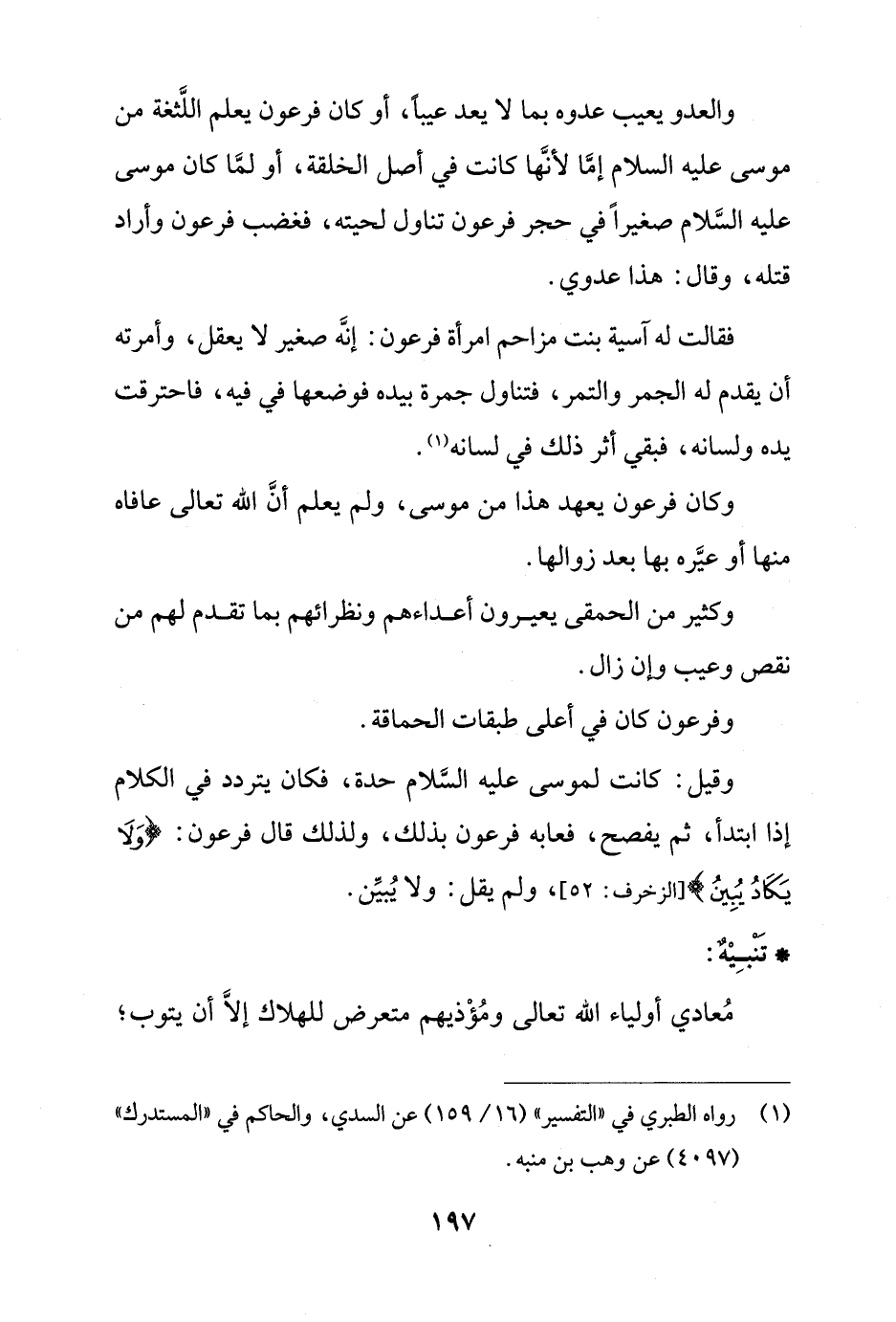 فقالت له آسية بنت مزاحم امرأة فرعون: إنَّه صغير لا يعقل، وأمرته أن يقدم له الجمر والتمر، فتناول جمرة بيده فوضعها في فيه، فاحترقت يده ولسانه، فبقي أثر ذلك في لسانه (¬1).