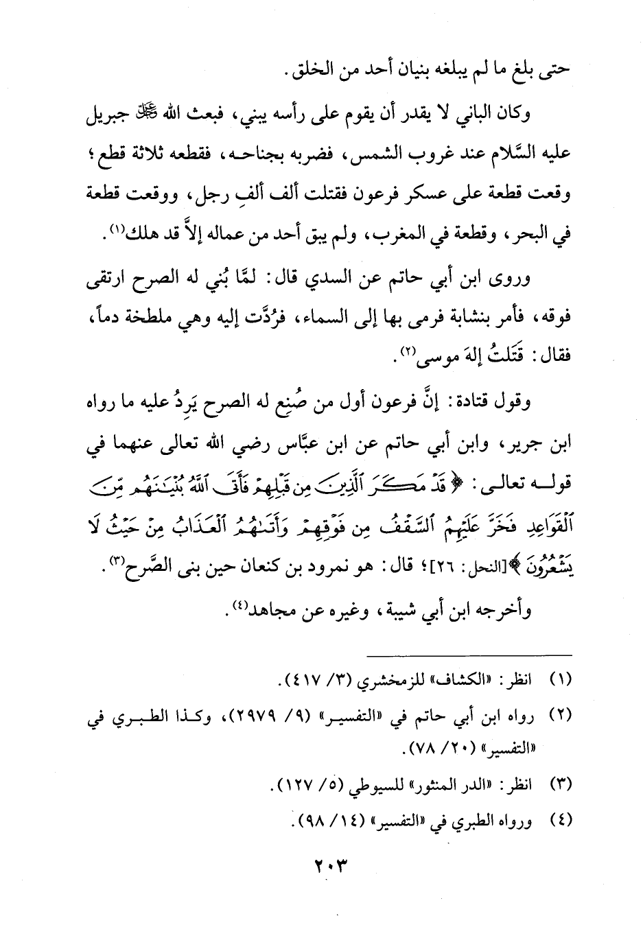 وقول قتادة: إنَّ فرعون أول من صُنِع له الصرح يَرِدُ عليه ما رواه ابن جرير، وابن أبي حاتم عن ابن عبَّاس رضي الله تعالى عنهما في قوله تعالى: {قَدْ مَكَرَ الَّذِينَ مِنْ قَبْلِهِمْ فَأَتَى اللَّهُ بُنْيَانَهُمْ مِنَ الْقَوَاعِدِ فَخَرَّ عَلَيْهِمُ السَّقْفُ مِنْ فَوْقِهِمْ وَأَتَاهُمُ الْعَذَابُ مِنْ حَيْثُ لَا يَشْعُرُونَ} [النحل: 26]؛ قال: هو نمرود بن كنعان حين بنى الصَّرح (¬3).