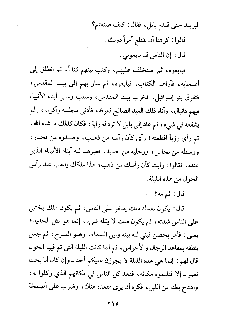 فبايعوه، ثم استخلف عليهم، وكتب بينهم كتاباً، ثم انطلق إلى أصحابه، فأراهم الكتاب، فبايعوه، ثم سار بهم إلى بيت المقدس، فتفرق بنو إسرائيل، فخرب بيت المقدس، وسلب وسبى أبناء الأنبياء فيهم دانيال، وأتاه ذلك العبد الصالح فعرفه، فأدنى مجلسه وأكرمه، ولم يشفعه في شيء، ثم عاد إلى بابل لا ترد له راية، فكان كذلك ما شاء الله، ثم رأى رؤيا أفظعته؛ رأى كأن رأسه من ذهب، وصدره من فخار، ووسطه من نحاس، ورجليه من حديد، فعبرها له أبناء الأنبياء الذين عنده، فقالوا: رأيت كان رأسك من ذهب؛ هذا ملكك يذهب عند رأس الحول من هذه الليلة.