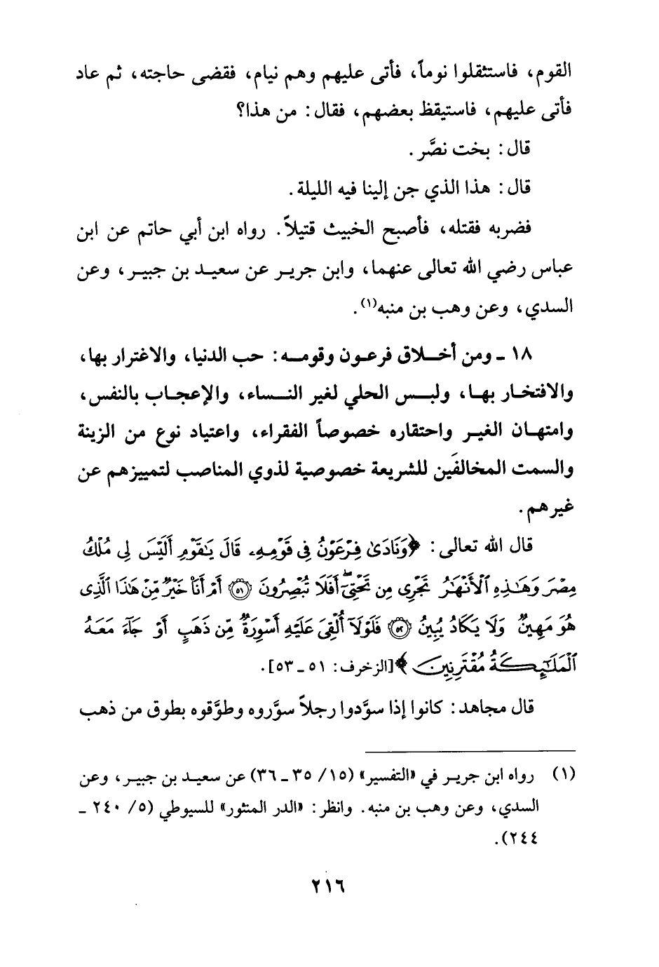 18 - ومن أخلاق فرعون وقومه: حب الدنيا، والاغترار بها، والافتخار بها، ولبس الحلي لغير النساء، والأعجاب بالنفس، وامتهان الغير واحتقاره خصوصاً الفقراء، واعتياد نوع من الزينة والسمت المخالفَين للشريعة خصوصية لذوي المناصب لتمييزهم عن غيرهم.