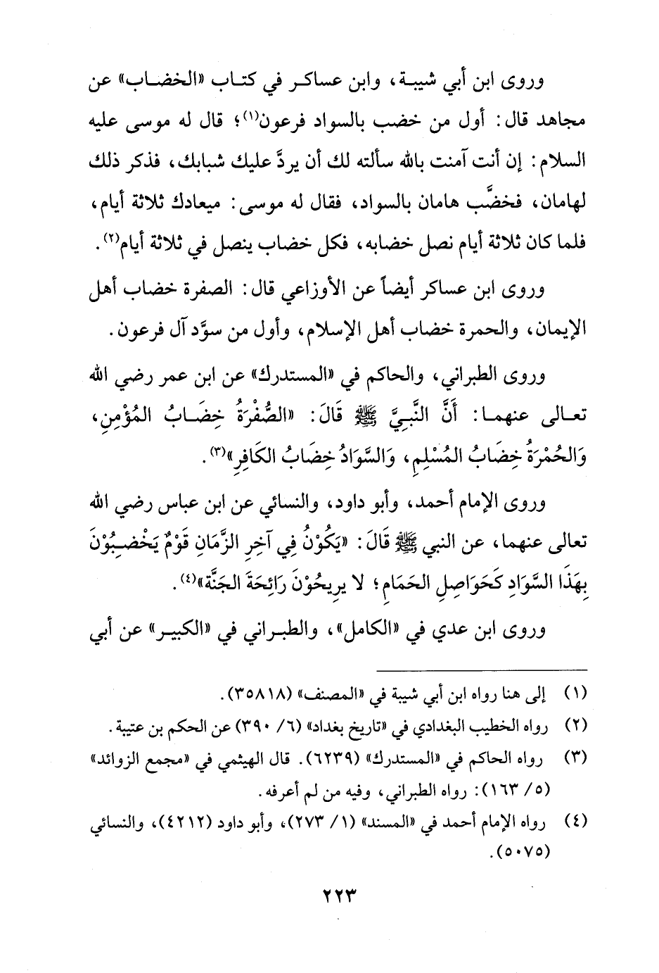 وروى ابن عساكر أيضًا عن الأوزاعي قال: الصفرة خضاب أهل الإيمان, والحمرة خضاب أهل الإِسلام، وأول من سوَّد آل فرعون.