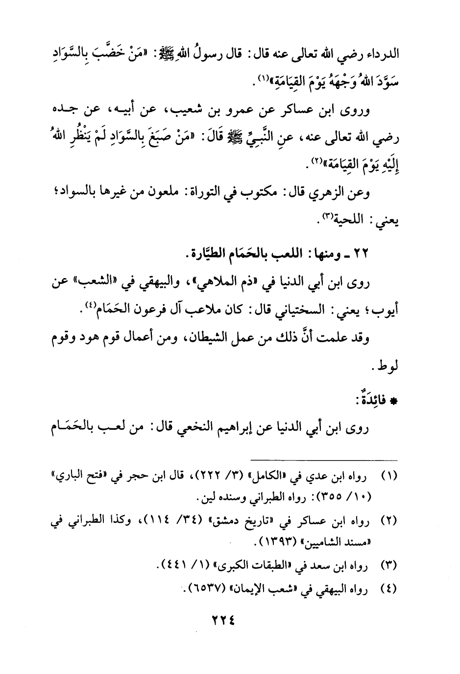 الدرداء رضي الله تعالى عنه قال: قال رسولُ اللهِ - صلى الله عليه وسلم -: "مَنْ خَضَّبَ بِالسَّوَادِ سَوَّدَ اللهُ وَجْهَهُ يَوْمَ القِيَامة" (¬1).