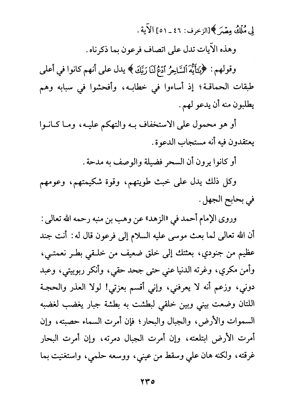 وروى الإِمام أحمد في "الزهد" عن وهب بن منبه رحمه الله تعالى: أن الله تعالى لما بعث موسى عليه السلام إلى فرعون قال له: أنت جند عظيم من جنودي، بعثتك إلى خلق ضعيف من خلقي بطر نعمتي، وأمن مكري، وغرته الدنيا عني حتى جحد حقي، وأنكر ربوبيتي، وعبد دوني، وزعم أنه لا يعرفني، وإني أقسم بعزتي! لولا العذر والحجة اللتان وضعت بيني وبين خلقي لبطشت به بطشة جبار يغضب لغضبه السموات والأرض، والجبال والبحار؛ فإن أمرت السماء حصبته، وإن أمرت الأرض ابتلعته، وإن أمرت الجبال دمرته، وإن أمرت البحار غرقته، ولكنه هان علي وسقط من عيني، ووسعه حلمي، واستغنيت بما
